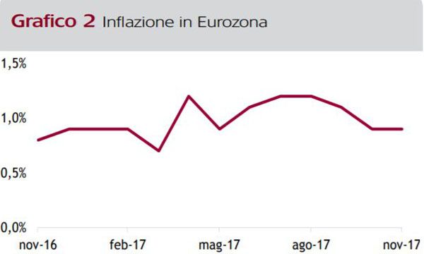 Bisogna evidenziare anche come non siano presenti ancora significative pressioni inflazionistiche (Grafico 2). L'inflazione è rimasta stagnante per tutto il 2017, ma la nostra previsione è che il 2018 possa caratterizzarsi per dei timidi segnali, conseguenti a una crescita che dovrebbe proseguire. Anche in questo caso spicca un'anomalia, sempre relativa agli Stati Uniti: l'inflazione core si trova a livelli toccati nel 2009, nell'immediato post recessione, quando però il tasso di disoccupazione era oltre il doppio rispetto ai livelli attuali.