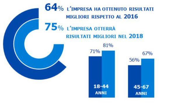 Nel dettaglio, secondo i risultati della ricerca, il 48% dei lavoratori italiani crede nel miglioramento della situazione economica del Paese, contro il 61% della media globale. Rispetto allo scorso anno, l'Italia ha guadagnato sette punti, anche se rimane stabilmente nella metà bassa della classifica. In Europa, soltanto Ungheria e Grecia hanno un indice di fiducia più basso (rispettivamente 47% e 37%) Molto più ottimismo emerge riguardo ai risultati raggiunti dalla propria azienda. Il 64% dei lavoratori è convinto che il proprio datore di lavoro abbia ottenuto risultati migliori rispetto all'anno precedente (tre punti in meno della media globale, pari al 67%), con i lavoratori più giovani che si mostrano più fiduciosi dei lavoratori più senior (71% di ottimisti nella fascia 18-44, contro il 56% dei 45-67enni). Ben tre lavoratori su quattro (il 75%, contro il 72% della media globale), invece, ritengono che le performance aziendali continueranno a migliorare anche nel 2018; anche in questo caso sono gli under 45 il segmento più ottimista (81% contro il 67% nella fascia 45-67).