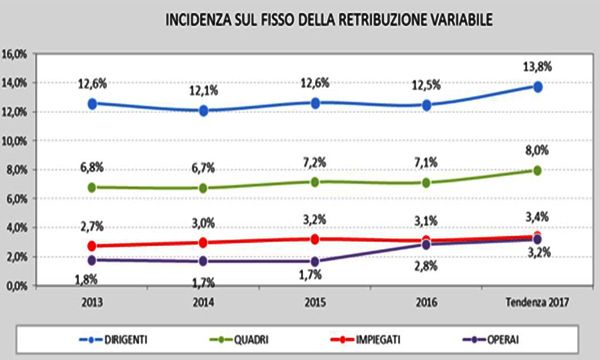 Nel primo semestre 2017 è cresciuto il peso della retribuzione variabile su quella base raggiungendo per tutte le categorie il livello più alto del quinquennio: il 13,8% per i Dirigenti (equivalente a più di 15.600 euro), l'8% per i Quadri (4.400 euro), il 3,4% per gli Impiegati (1.000 euro), il 3,2% per gli Operai (800 euro circa).