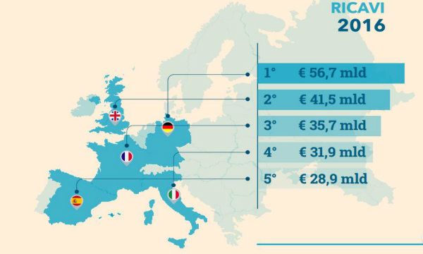 Tra il 2012 e il 2016 l'Italia ha subito il maggiore ridimensionamento dei ricavi (-17,5%), seguita da Francia (-12,2%), Spagna (-8,3%), UK (-7,6%) e Germania (-2,3%). Ma il 2016 è stato un anno di ripresa per Spagna (+8,6% sul 2015), UK (+0,3%) e Italia (+0,2%).