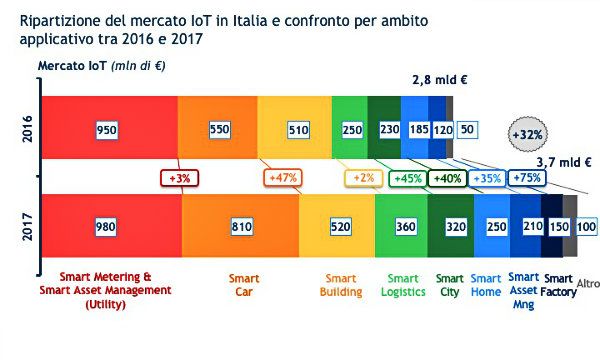 A trainare l'IoT in Italia è anche per il 2017 lo Smart Metering che, per effetto degli obblighi normativi per il gas (2,4 milioni di contatori gas installati presso le utenze domestiche nel 2017) e dell'installazione della seconda generazione di contatori elettrici intelligenti, raggiunge i 980 milioni di euro (26% del mercato, +3% rispetto al 2016). Subito dopo, ormai a breve distanza, troviamo la Smart Car con 810 milioni di euro (22% del mercato, +47%), grazie anche agli 11 milioni di veicoli connessi a fine 2017, oltre un quarto del parco circolante in Italia. A seguire troviamo le applicazioni di Smart Building (pari a 520 milioni di euro, 14% del mercato IoT), le soluzioni IoT per la logistica (360 milioni di euro, +45%), la città (320 milioni di euro, +40%) e la casa (250 milioni di euro, +35%). Smart Metering e Smart Car, insieme a Smart Home e Industrial IoT, sono gli ambiti di cui si prevedono i tassi di crescita più significativi nel 2018.