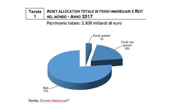 Il 2017 è stato l'anno d'oro per il risparmio gestito in immobili a livello mondiale: il patrimonio delle diverse forme di fondi immobiliari (quotati, non quotati, Reit), in continua crescita, alla fine dell'anno ha raggiunto 2.830 miliardi di euro, in aumento dell'8% sul 2016, con il secondo miglior risultato storico. La composizione tipologica è stabile, con la concentrazione del 77% del patrimonio in mano ai Reit. Questi sono alcuni dei dati emersi oggi nel corso della presentazione del Rapporto 2018 "I Fondi immobiliari in Italia e all'estero", realizzato da Scenari Immobiliari in collaborazione con lo Studio Casadei che ha curato la parte di analisi finanziaria.