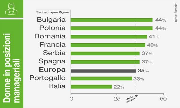"In Europa, solo un manager su tre è donna", così Eurostat intitolava il report dedicato all'International Women's Day lo scorso anno. E continuava specificando che le donne con ruoli manageriali in Europa guadagnano 77 centesimi ogni euro in busta paga di un collega uomo. Uno scenario che riguarda da vicino anche gli otto Paesi europei in cui opera Wyser, la società internazionale di Gi Group, che dal 2013 si occupa di ricerca e selezione di profili manageriali.