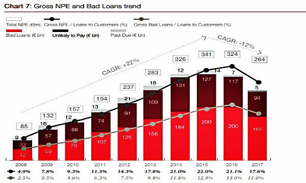 Alla fine del 2017, le sofferenze lorde sono scese a 165 miliardi (Gross Book Value), in calo di 35 miliardi nell'ultimo anno.
