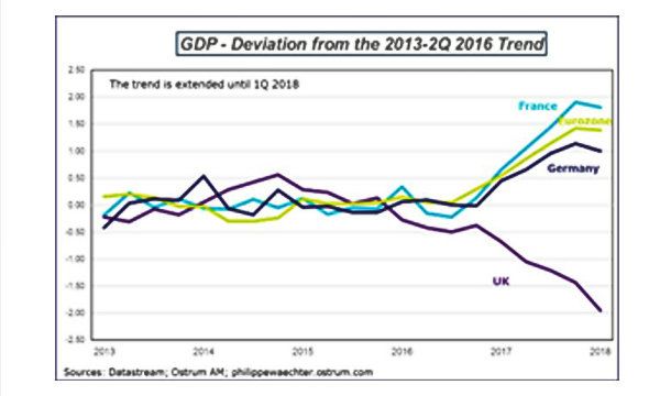 Secondo Philippe Waechter - Chief Economist, Ostrum Asset Management, "l'impatto più evidente della Brexit è il minore slancio della crescita registrato nel Regno Unito dopo il referendum. La dinamica è rallentata e il Regno Unito non ha approfittato del forte miglioramento della crescita dell'area dell'euro nel 2017.