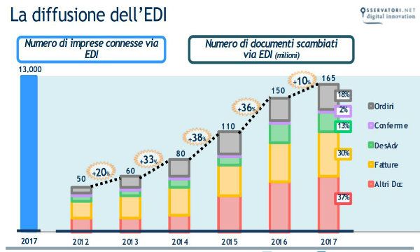 Sono circa 130mila le imprese che nel 2017 hanno digitalizzato il ciclo dell'ordine, adottando strumenti di eSupply Chain Execution, con un incremento dell'8% rispetto al 2016. Fra queste, 13mila (+8%) sono connesse tramite sistemi EDI che si scambiano i principali documenti del ciclo dell'ordine (ordine, conferma d'ordine, avviso di spedizione e fattura). Oltre il 96% delle imprese connesse appartiene a soli cinque settori: automobile, elettrodomestici ed elettronica di consumo, farmaceutico, largo consumo e materiale elettrico. Il documento più scambiato è la fattura (il 30% del totale dei documenti in EDI, +10%), seguito dall'ordine (18%, +7%) e dall'avviso di spedizione (13%, +8%).
