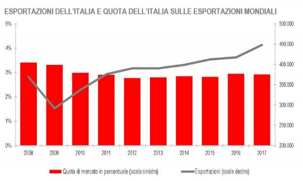 Secondo il Rapporto Istat-ICE le esportazioni sono hanno raggiunto i 448 miliardi (+7,4%), il saldo manifatturiero i 96 miliardi, e siamo al 3°posto per crescita tra i top 10 esportatori mondiali