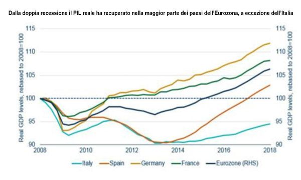 Oggi l'Italia sta ancora risentendo degli effetti della doppia recessione: il PIL reale è inferiore al 5% rispetto ai livelli che si erano registrati prima della crisi del 2008 (vedi grafico). Il tasso di disoccupazione si è ridotto, ma l'11% è ancora un livello elevato. Inoltre, la disoccupazione giovanile è molto alta attestandosi a circa il 30%.