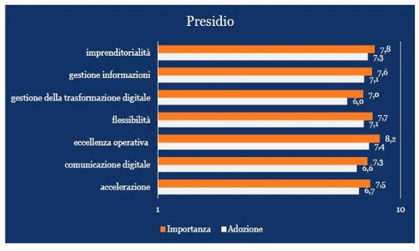 Chiudono la classifica, la comunicazione digitale e, ultima, la gestione della trasformazione digitale che raggiunge appena il livello 7 di importanza e il livello 6 di adozione.