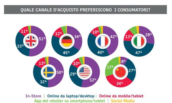 Lo shopping in negozio rimane l'esperienza più diffusa (preferita dal 38% degli intervistati) nella maggioranza dei paesi esaminati, tranne la Cina, dove online/mobile (34%) sono risultate le opzioni preferite. Per quanto riguarda lo shopping in negozio, il 34% degli intervistati afferma che trovare il prodotto disponibile è l'aspetto più importante della shopping experience (il 20% per gli intervistati italiani), mentre per il 29% è l'assortimento (40% in Italia).