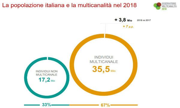 Internet e il digitale sono sempre più presenti nelle abitudini di acquisto degli italiani: gli individui multicanale - gli utenti che usufruiscono di servizi di eCommerce o per i quali il digitale ha un ruolo nel proprio percorso di acquisto - sono ormai 35,5 milioni di persone (pari al 67% della popolazione sopra i 14 anni), in crescita di sette punti percentuali (p.p.) rispetto ai 31,7 milioni del 2017, dopo cinque anni di stabilità.