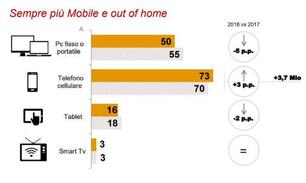 La dispersione e l'incremento della fruizione riscontrate per il mezzo televisivo hanno interessato anche i canali digitali, che nel 2018 hanno registrato una reach media giornaliera pari al 52,1% fra gli InfoShopper(di cui 23,8% totale Pc e 44,9% totale mobile), a dieci punti percentuali di distanza dai valori registrati fra gli Everywhere Shopper (62,1%, di cui 30,7% totale Pc e 53,8% totale mobile). Questo conferma come quest'ultimo segmento manifesti comportamenti sempre più evoluti e frammentati anche nell'uso dei media.