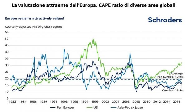 La valutazione complessiva del mercato rimane attraente, con il CAPE ratio (cyclically-adjusted price-to-earnings ratio) che è circa 20% al di sotto della media storica (vedi grafico). L'enorme divergenza di performance rispetto agli USA di recente ha iniziato a rientrare e ci aspettiamo che continui a ridursi.