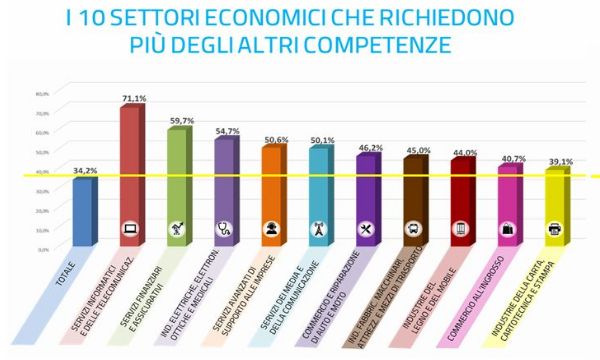 In particolare, nel 2017 la competenza che registra la maggiore frequenza di richiesta da parte delle imprese riguarda le abilità digitali di base, quali l'"utilizzo delle tecnologie internet e l'abilità nella gestione di strumenti di comunicazione visiva e multimediale", richieste al 57,7% dei profili in entrata. A seguire "la capacità di utilizzare linguaggi matematici ed informatici per organizzare e valutare informazioni qualitative e quantitative" (50,9%).