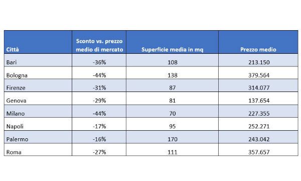 Supera il 30% di sconto anche quello che si può ottenere a Bari e Firenze. Nel capoluogo pugliese gli immobili all'asta misurano in media 108 metri quadri, per i quali si spendono 213.000 euro, il 36% rispetto al prezzo medio rilevato nella città per gli immobili in vendita. A Firenze, per un immobile da 87 metri quadri all'asta la spesa media è di 314.000 euro, il 31% in meno rispetto al mercato delle compravendite tradizionali.