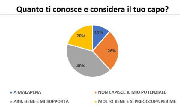 Inoltre, il 61% dice di sapere perfettamente cosa il management si aspetta da lui e qual è il suo ruolo, il 34% dice di esserne abbastanza consapevole, il 4% si sente insicuro e solo l'1% dice di non avere ancora capito cosa il capo si aspetti da lui.