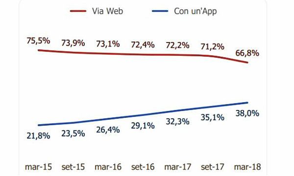 Quali sono le abitudini dei correntisti online? Gli utenti preferiscono accedere al proprio conto online via web (tramite computer), pur registrando un trend in calo (dal 75,5% del 2015 al 66,8% del 2018). Al contrario, grazie alla diffusione degli smartphone e delle App, si assiste al boom del mobile banking con il raddoppio degli utenti (+106%), passati dai 3,5 mln del 2015 ai 7,3 del 2018: oggi quasi quattro correntisti online su dieci (38%) sono utenti di mobile banking. Per quanto riguarda le operazioni svolte dai correntisti online, le principali riguardano la consultazione dell'estratto conto e dei documenti informativi (80%) e le disposizioni di pagamento come bonifici, pagamenti F24 e ricariche telefoniche, indicati dal 67% del campione (+9 p.p. sul 2015), ma aumenta anche l'uso per i pagamenti di bollettini postali e multe (40%).