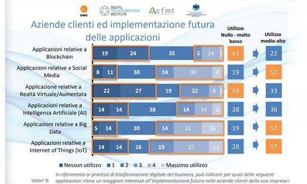 Le aziende coinvolte nella ricerca ritengono che un 46% delle imprese clienti utilizzino molto o abbastanza i social network, con un 52% pronto a investirci per utilizzarli in futuro. Il grado di complessità di integrazione di canali digitali social è ritenuto particolarmente complesso nel controllo di qualità (62%), nella contabilità e nel controllo di gestione (60%), in progettazione, ricerca e sviluppo (56%) e nella produzione di prodotti e nella erogazione di servizi (55%).