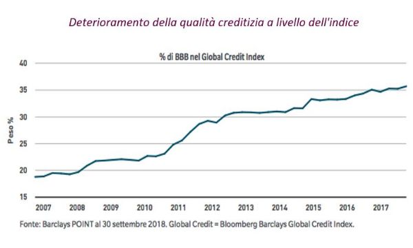 Uscendo dalla crisi del 2008, le società hanno osservato un aumento dei margini netti riconducibile al calo dei costi di produzione. Eppure, a tre o quattro anni dall'inizio del ciclo economico, la crescita globale stava ancora facendo i conti con i postumi della crisi finanziaria. Mentre i margini apparivano insolitamente elevati, la crescita in termini unitari e il pricing power restavano modesti. Molte società hanno fatto ricorso al proprio bilancio per sostenere i livelli di crescita del free cash flow, e i mercati del credito sono stati ben lieti di concedere finanziamenti. Con la fine del ciclo, le emissioni di obbligazioni e i coefficienti di leva finanziaria sono cresciuti e la qualità complessiva del mercato delle obbligazioni corporate ha subito un deterioramento. Come evidenziato nel grafico, la percentuale di obbligazioni societarie con rating BBB nel Global Credit Index è quasi raddoppiata dalla crisi finanziaria globale.