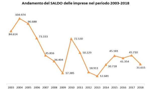 Nonostante un 2018 trascorso con l'affanno, il sistema delle imprese alla fine mette a segno un saldo positivo tra aperture e chiusure. Nell'anno da poco concluso i terminali delle Camere di commercio hanno registrato l'iscrizione di 348.492 nuove imprese (8.500 in meno rispetto al 2017) e 316.877 chiusure di imprese esistenti (quasi 6mila in più rispetto all'anno precedente). Il risultato di queste due dinamiche ha consegnato a fine dicembre un saldo positivo per 31.615 imprese, una crescita dello 0,5%. Anche se positivo, il dato 2018 segna un rallentamento rispetto al 2017.