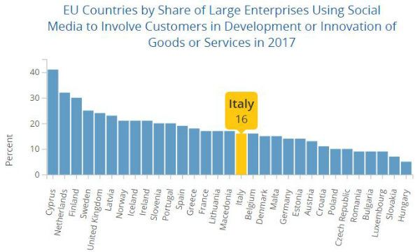 Sempre guardando alle grandi imprese (oltre 250 dipendenti) all'interno dell'UE, assistiamo a sforzi significativi per utilizzare i social media per coinvolgere i clienti direttamente nell'innovazione o nello sviluppo di un servizio o di beni. Le principali nazioni europee a questo riguardo sono Cipro, dove il 41% delle grandi imprese utilizza i social media in questo modo; Paesi Bassi (32%); Finlandia (30%); Svezia (25%); e il Regno Unito (24%). Al contrario, solo il 5% delle grandi imprese in Ungheria utilizza i social media in questo modo. In Italia abbiamo fatto registrare un 16%.