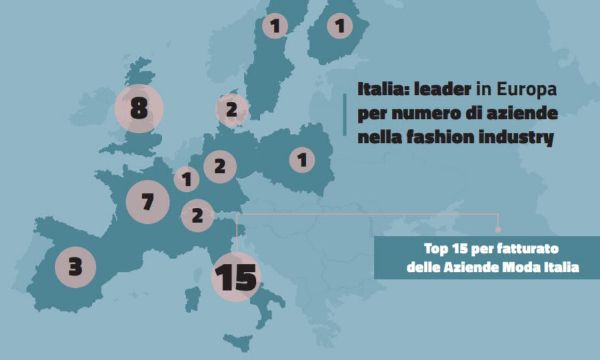 Nel periodo 2013-2017, i 43 principali gruppi europei della moda hanno registrato ricavi aggregati per 226,2 mld di euro (+33% sul 2013). Nonostante l'Italia con le sue big 15 sia il Paese più rappresentato a livello numerico (oltre un terzo del totale), è la Francia, con il 30,3% del fatturato aggregato, ad aggiudicarsi il primato per giro d'affari (favorita anche dal formidabile apporto dei marchi italiani acquistati dai colossi francesi). Sul podio anche Italia (13,4%) e Spagna (13%), entrambe doppiate dalla Francia.