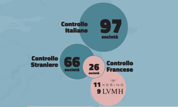 Tra i gruppi principali, il gigante francese LVMH, con 70 marchi in cinque diversi comparti, si conferma leader assoluto per dimensioni (con un fatturato pari a 42,6 mld di euro). Inseguono a grande distanza il gruppo spagnolo Inditex che controlla Zara (25,3 mld), il tedesco Adidas (21,2 mld), lo svedese H&M (20,3 mld) e l'altro francese Kering, proprietario, fra gli altri, di Gucci e Bottega Veneta (15,5 mld).