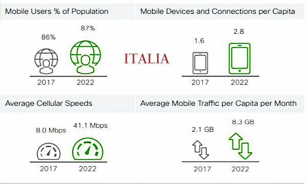 Secondo lo studio Cisco Mobile VNI, nel 2022 sulle reti mobili italiane ci saranno 165 milioni tra device e connessioni IoT (oggetti connessi) attive, con una crescita annua composta (CAGR) dell'11,1% rispetto al 2017, quando ce n'erano 97,6 milioni.