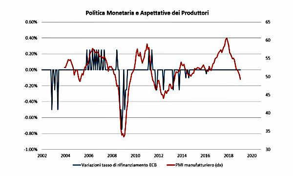 Gli indicatori anticipatori ci forniscono un quadro congiunturale impietoso: L'indice PMI composito per l'Eurozona ha rallentato di 7.4 punti dai massimi di gennaio 2018, con una frenata ancora più brusca (in eccesso di 11 punti) per il settore manufatturiero. Di riflesso, il nostro ufficio studi ha rivisto al ribasso le stime del PIL da 1.8% nel 2018 a 1% nel 2019 e 0.9% nel 2020. Se da un lato il quasi-stallo congiunturale in Italia (0.2% nel 2019) è motivabile con un mix di fattori globali e domestici, il rallentamento della Germania (0.9% nel 2019) desta preoccupazioni alla luce del possibile cambiamento strutturale dell'output tedesco. Non solo l'industria automobilistica, ma anche il settore bancario sono attualmente oggetto di scrupolose analisi.