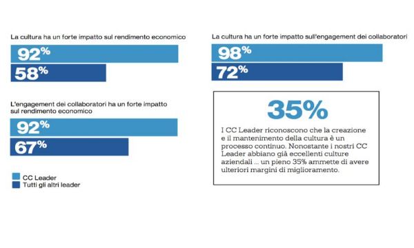 - il 92% dei senior leader di aziende CC ritiene che la cultura aziendale abbia un forte impatto sulle performance finanziarie, a fronte di un 58% dei loro colleghi di aziende non CC;