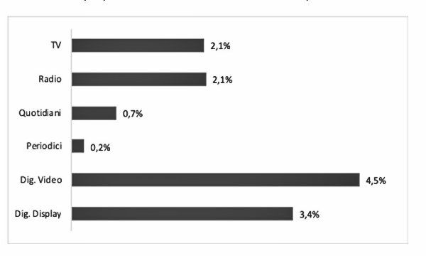 Per quanto riguarda lo share per mezzo, la quota della TV prosegue il trend discendente del 2018 (49,8%) anche nel 2019 (48,9%) e continua nel 2020 (48,3%) - mentre il comparto digitale prosegue il suo percorso di ascesa quale mezzo più veloce nel seguire le sempre più mutevoli abitudini dei consumatori, più online e mobili. Se nel 2018 il digital ha rappresentato il 27,4% del mercato, nel 2019 dovrebbe crescere di circa due punti percentuali, arrivando a rappresentare il 29,3% dello share. Dato che non prevede battute d'arresto e nel 2020 dovrebbe superare la soglia del 30%.