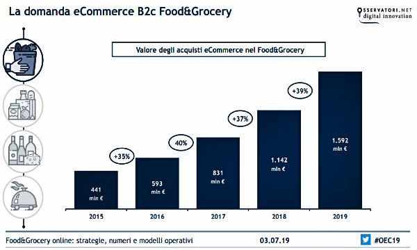 "Il Food&Grocery online è il settore che nel 2019 cresce con il ritmo più sostenuto: +39% a fronte del +15% dell'eCommerce nel suo complesso. Gli acquisti online dei consumatori italiani (su siti sia italiani sia stranieri) in questo settore incidono però ancora poco sul totale degli acquisti retail. La penetrazione infatti supera di poco l'1% ed è pari a circa un sesto di quella media dei prodotti (6%)", ha dichiarato Riccardo Mangiaracina, Responsabile Scientifico dell'Osservatorio eCommerce B2c Netcomm - Politecnico di Milano. "Nel Food&Grocery la componente più rilevante (pari all'89% del comparto) è rappresentata dall'Alimentare, a sua volta suddivisibile in 3 principali segmenti: Grocery Alimentare (prodotti da supermercato) con un valore eCommerce di 476 milioni di euro, Enogastronomia (prodotti di nicchia) con 383 milioni di euro e Food Delivery (piatti pronti) con 566 milioni di euro".
