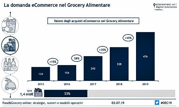 Un mercato che cresce ma non è ancora particolarmente significativo. Almeno per ora. E' quello del Food&Grocery online, che nel 2019 sfiora gli 1,6 miliardi di euro, +39% rispetto al 2018. Nonostante la dinamicità del settore, il Food&Grocery è però ancora marginale: la sua incidenza sul totale eCommerce B2C italiano (pari a 31,5 miliardi di euro) è nel 2019 pari al 5%.