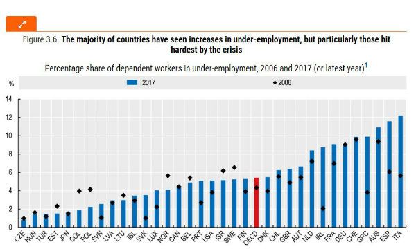 Siamo davanti a Spagna, Australia, Grecia, Svizzera, Germania e Francia. E lo dice l'OCSE Employment Outlook 2019 sul futuro del lavoro. La classifica è quella poco onorevole dei lavoratori sotto occupati, cioè soggetti che hanno un impiego part-time (30 ore o meno la settimana), che riferiscono di non riuscire a trovare un lavoro a tempo pieno o di lavorare più ore. Ci sarebbe da scrivere libri sulla situazione del lavoro in Italia, a partire dal suo costo fino alla deflazione salariale che ha portato ad una crescita vicina allo zero da molti anni a questa parte. Ma limitiamoci alle parole dell'OCSE.