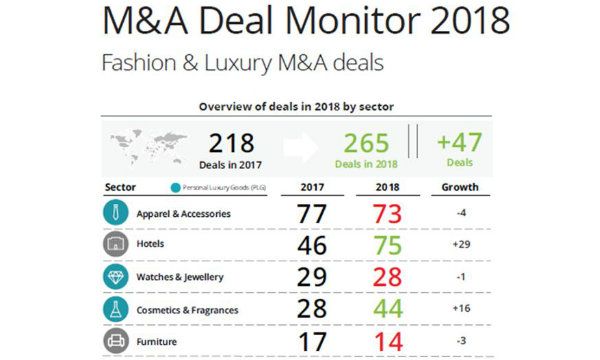 Il 2018 si è confermato un anno in grande fermento per il mondo del lusso, registrando un record di 265 operazioni M&A, un aumento di 47 deal rispetto all'anno precedente.