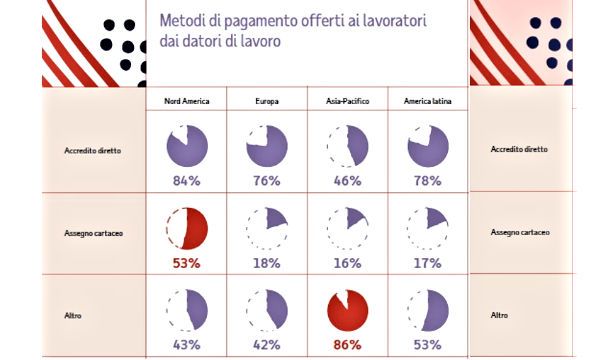 In America del Nord il 53% delle aziende offrano come metodo di pagamento ancora l'assegno cartaceo. È l'Asia invece la regione più moderna e aperta a diverse forme di pagamento: in Cina, la metà dei datori di lavori offre pagamenti con paycard, il 41% pagamenti mobili e il 38% opzioni digitali. In questa regione, il 74% dei dipendenti preferisce carte prepagate e opzioni mobili o digitali rispetto all'accredito diretto.