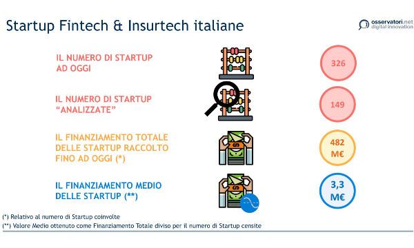 Sono 326 le startup Fintech & Insurtech censite in Italia, per un volume di finanziamenti complessivo di 654 milioni di euro. In media 2,6 milioni per azienda, non ancora capitali consistenti (con l'eccezione alcuni di casi limitatissimi come i 100 milioni di Prima Assicurazioni e gli oltre 70 di MoneyFarm). I settori in cui operano sono eterogenei: dai servizi bancari (42%) ai servizi tecnologici orientati al mondo finanziario e assicurativo (25%).