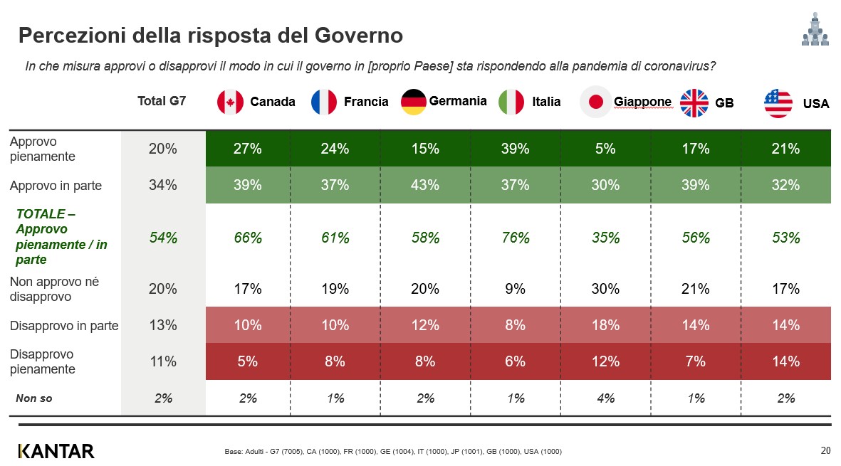Lo stato dove l'opinione pubblica approva maggiormente le azioni intraprese dal Governo è proprio l'Italia, dove l'impatto del virus sulla salute dei cittadini è in effetti attualmente il più pesante. Il 76% dei cittadini in Italia afferma infatti di approvare la risposta del proprio Governo alla pandemia (molto o abbastanza). Alla domanda sulla cooperazione tra Paesi in tutto il mondo per fronteggiare la pandemia, il 71% delle persone in Canada la considera molto o abbastanza buona, rispetto al 65% negli Stati Uniti, al 62% in Gran Bretagna, al 54% in Francia, al 45% in Germania? mentre in Italia è il 37%. Sono dati piuttosto significativi.