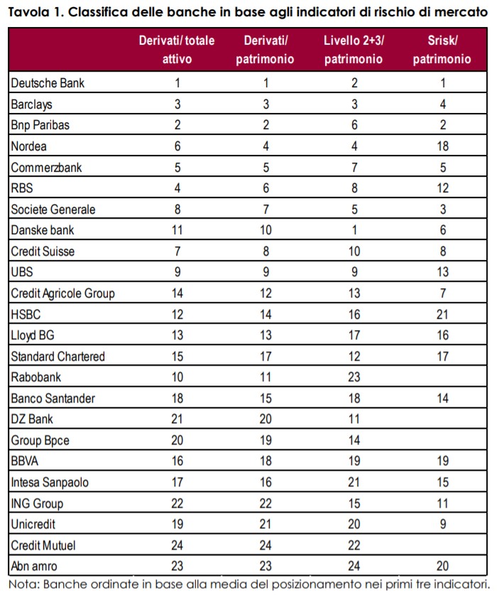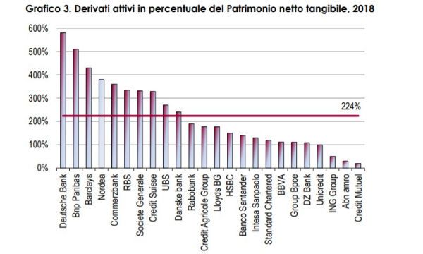 "Emerge come Deutsche Bank, Bnp Paribas e Barclays abbiano indicatori pari ad almeno il doppio rispetto alle 23 banche esaminate. L'ingente presenza dei derivati nei bilanci di queste banche desta preoccupazione: i derivati presenti nel bilancio di Deutsche Bank sono pari a quasi 6 volte il patrimonio della banca, nel caso di BNP Paribas si supera di poco il 500%, mentre con Barclays la percentuale arriva al 430%. Inoltre, sopra il 300% si posizionano, nell'ordine, Nordea, Commerzbank, RBS, Société Générale e Credit Suisse. Se ci si focalizza sulle banche operative nell'Area euro è evidente come le banche tedesche e francesi mostrino valori mediamente più elevati rispetto alle banche di altre nazioni.