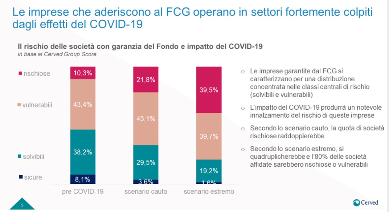 Il COVID-19 infatti sta producendo effetti molto rilevanti sui ricavi delle imprese italiane. Gli impatti su quelle che accedono al Fondo Centrale potrebbero essere ancora più significativi, perché molte appartengono a settori - l'edilizia e gli impianti per l'edilizia, la ristorazione, gli autotrasporti, il commercio al dettaglio specializzato - tra i più colpiti dall'epidemia, con cali di fatturato previsti tra il 20 e il 30%. Anche le conseguenze sul loro profilo di rischio sono altrettanto importanti: in base alle valutazioni di Cerved, la quota di società rischiose aderenti al Fondo nel 2019, che rappresentava il 10,3%, potrebbe più che raddoppiare nello scenario cauto (21,8%) e quadruplicare in quello peggiore (39,5%), cioè se la crisi perdurasse fino a fine anno.