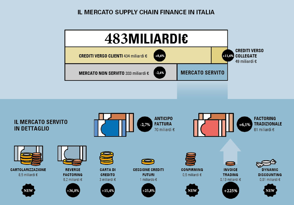 Il mercato potenziale del Supply Chain Finance in Italia è enorme, pari a 483 miliardi di euro di crediti commerciali, e in crescita dell'1,1% in un anno, ma solo il 31% è già servito da soluzioni che consentono alle imprese di finanziare il capitale circolante facendo leva sul ruolo e le relazioni della filiera, per un valore di 150 miliardi di euro. Sebbene ancora limitato, in Italia il Supply Chain Finance sta crescendo, diventando sempre più strategico per le imprese, ancor più in questo momento di crisi di liquidità a seguito dell'emergenza sanitaria, grazie al supporto delle tecnologie digitali, all'approccio manageriale di utilizzo che si sta diffondendo e alla varietà di soluzioni a disposizione, per cui ormai non è più solo sinonimo di Reverse Factoring.