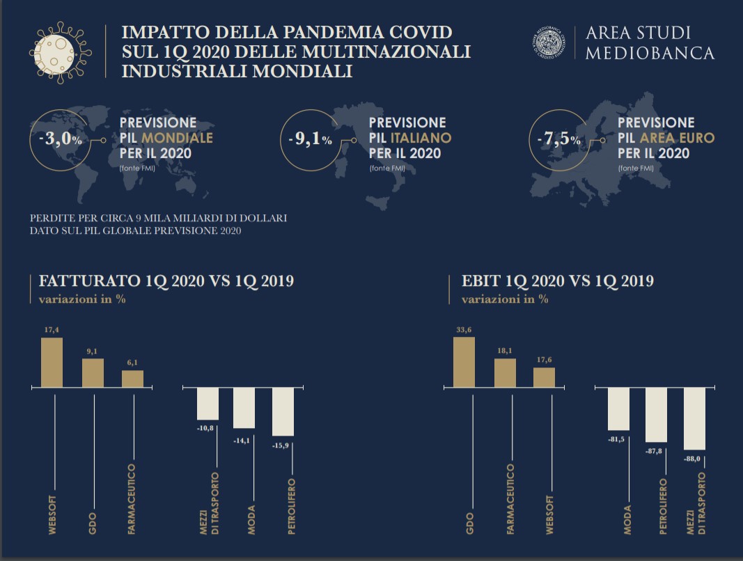 L’Area Studi Mediobanca ha analizzato l’impatto della pandemia del COVID-19 sui bilanci del primo trimestre 2020 di oltre 150 grandi multinazionali con fatturato annuale superiore a 3mld di euro, confrontandoli con quelli dello stesso trimestre del 2019. Vediamo i principali risultati.La pandemia del COVID-19 sta avendo un impatto enorme sull’economia reale a livello globale. Si tratta di una crisi unica nel suo genere, di proporzioni senza precedenti, le cui conseguenze stanno colpendo tutti gli attori economici, comprese le grandi multinazionali. A farne le spese sono soprattutto i produttori di aeromobili, i colossi Oil & Energy e quelli della Moda, che hanno registrato bruschi cali in tutte le principali voci di bilancio. I cambiamenti nelle abitudini di acquisto hanno, al contrario, prodotto un forte incremento di ricavi per le WebSoft, la GDO e le case farmaceutiche. In generale, gli effetti della pandemia nel primo trimestre del 2020 sono stati pesanti specialmente per le aziende che fatturano maggiormente in Asia, in particolare in Cina. Qui però, già da fine marzo del 2020, si intravedono alcuni segnali di ripresa. Discorso inverso per chi opera per lo più in Europa e nelle Americhe: per queste aziende l’impatto è avvenuto qualche settimana dopo e si prevede una maggiore contrazione nel secondo trimestre del 2020. I dati del primo semestre del 2020 mostreranno, con molta probabilità, i segni più evidenti della crisi economica, mentre la ripresa è attesa per il secondo semestre, in particolare per il quarto trimestre 2020. Secondo quanto dichiarato da molte multinazionali, l’impatto del Covid-19 sui numeri di tutto il 2020 rimane per diversi motivi ancora difficile da prevedere: su tutti, la grande incertezza generata da una crisi la cui scala, durata ed estensione geografica sono in continua evoluzione.