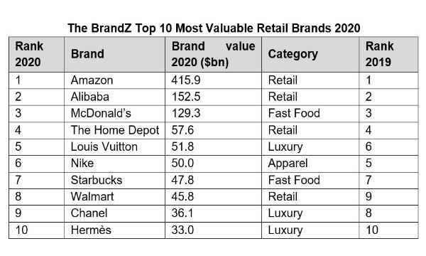 Lo studio BrandZ Top 75 Most Valuable Global Retail Brands, di WPP e Kantar, mostra una crescita del 12% nell'ultimo anno che raggiunge un valore di 1500 miliardi di dollari. Il Report, lanciato al World Retail Congress, offre indicazioni sulle marche che hanno maggior probabilità di successo nel contesto post-COVID-19 anche grazie ai dati di performance azionaria ad Aprile 2020 per riflettere l'impatto della pandemia. Evidenzia inoltre il ruolo centrale che il Retail sta avendo nell'economia globale con le risposte dei brand alle modifiche dei comportamenti del "nuovo" consumatore mentre si affrontano cambiamenti critici nel business e restrizioni commerciali.