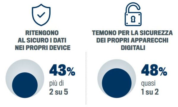 Gli italiani temono per la sicurezza delle informazioni memorizzate sui propri dispositivi digitali: un intervistato su due (48%) le considera non al sicuro, una percezione negativa maggiormente radicata al Sud e tra coloro che si affidano al web per ragioni di lavoro. Il quadro muta radicalmente quando si parla di acquisti online, che invece vengono ritenuti sicuri dal 68% degli italiani. Interessante anche constatare come, in materia di "controllo sociale", il percepito cambi molto a seconda della natura del "controllore": il 62% degli utenti ritiene che Governo e forze dell'ordine controllino una parte delle proprie attività in Rete, ma lo accetta in nome della sicurezza, mentre quasi tre persone su quattro pensano che una parte dei dati digitali sia monitorata da imprese pubblicitarie e, per il 59%, ciò è considerato un rischio per la privacy.