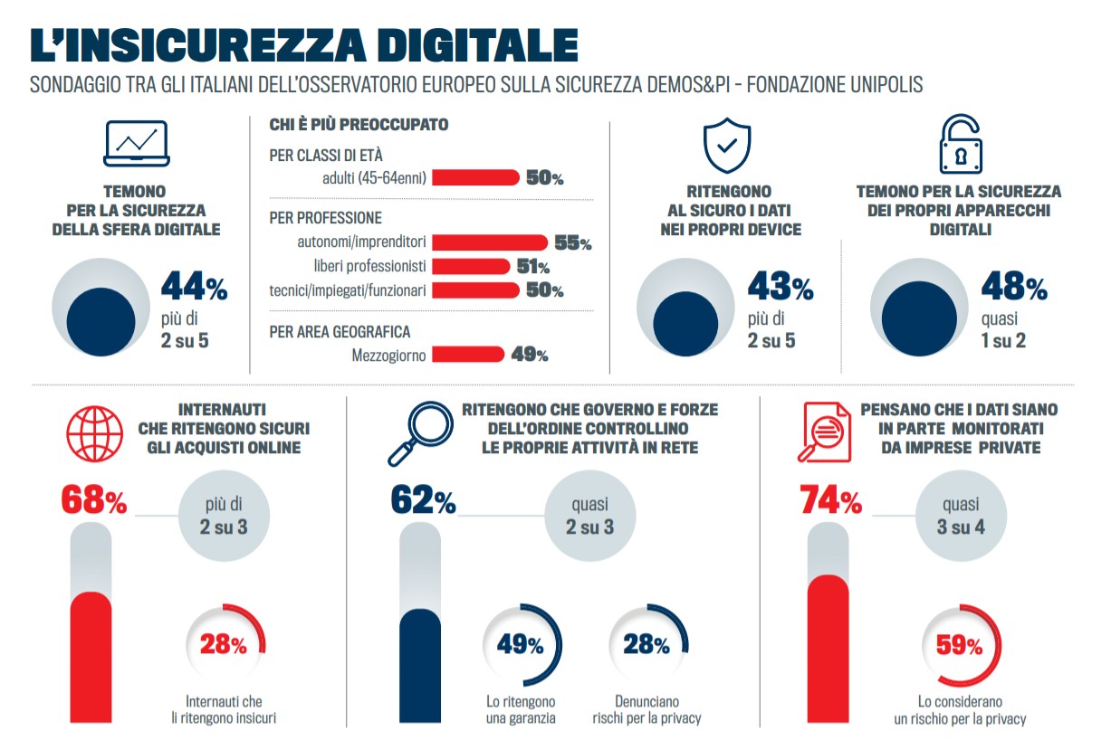 La sicurezza digitale è al centro del pensiero degli italiani. Il 44% del campione teme per la sicurezza della sfera digitale: l'indice tocca i livelli più elevati nelle componenti adulte della popolazione: superiori al 50% nella fascia compresa tra i 45 e i 64 anni. In modo coerente con i tassi di utilizzo del web, l'insicurezza digitale riguarda anzitutto le persone di istruzione medio-alta. Dal punto di vista della categoria socio-professionale, i livelli più elevati si osservano tra i lavoratori autonomi e gli imprenditori (55%), tra i liberi professionisti (51%) e tra i tecnici, impiegati, dirigenti e funzionari (50%), ossia in quei settori che si affidano alla Rete (anche) per ragioni di lavoro. Infine, si osserva un livello più alto nelle regioni del Mezzogiorno (49%), rispetto alle altre aree del Paese.