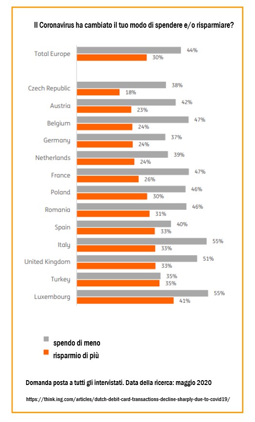 Guardando all'intero campione degli intervistati, in tutta Europa, poco meno della metà (il 44%) ha dichiarato di spendere meno a causa del Coronavirus, mentre tre su dieci hanno detto di risparmiare di più.