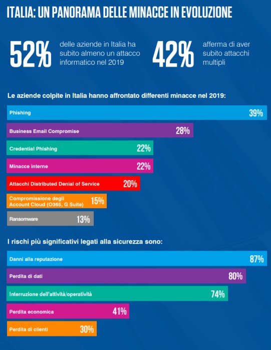 Il phishing è stato la tipologia di attacco più spesso registrato dalle aziende italiane nel 2019 (39%), seguito da Business email Compromise (28%), Insider threat e credential phishing, entrambi al 22%. Anche l'emergenza COVID-19 ha avuto i suoi effetti, con il 26% delle imprese italiane che hanno ammesso un aumento del numero di attacchi legati alla pandemia.
