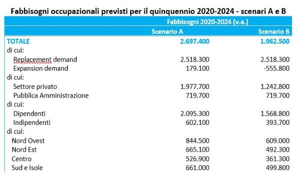 Tra il 2020 e il 2024 il sistema economico italiano dovrà sostituire oltre 2,5 milioni degli attuali occupati, perché questi ultimi avranno raggiunto l'età di pensionamento o per altre cause. Questo dato, sommato agli incrementi (o alla diminuzione) degli occupati previsti in base ai possibili andamenti annuali del PIL, determinerà un fabbisogno complessivo compreso tra 1,9 e 2,7 milioni di lavoratori.