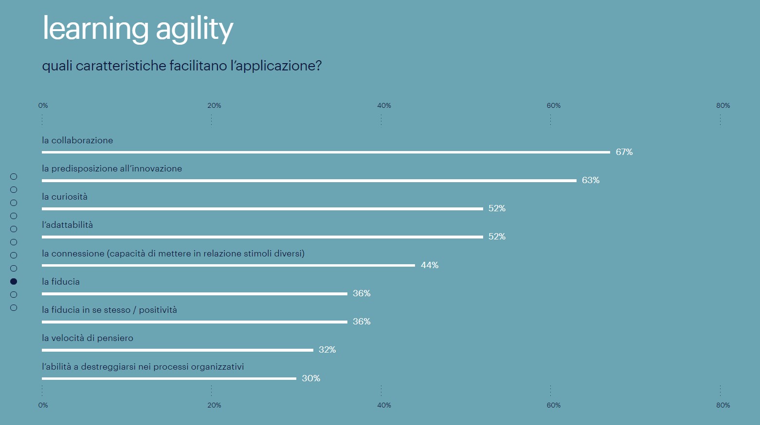 Secondo i direttori del personale italiani, la learning agility è da applicare prioritariamente nelle modalità di lavoro/dei processi interni e direzione operativa (secondo il 60% degli HR), poi nel cambiamento organizzativo (45%) e in minor misura nel clima interno (35%). La grande maggioranza degli HR (85%) concorda sul fatto che sia una competenza acquisibile, solo uno su sei invece ritiene che sia una caratteristica innata che non si può allenare.