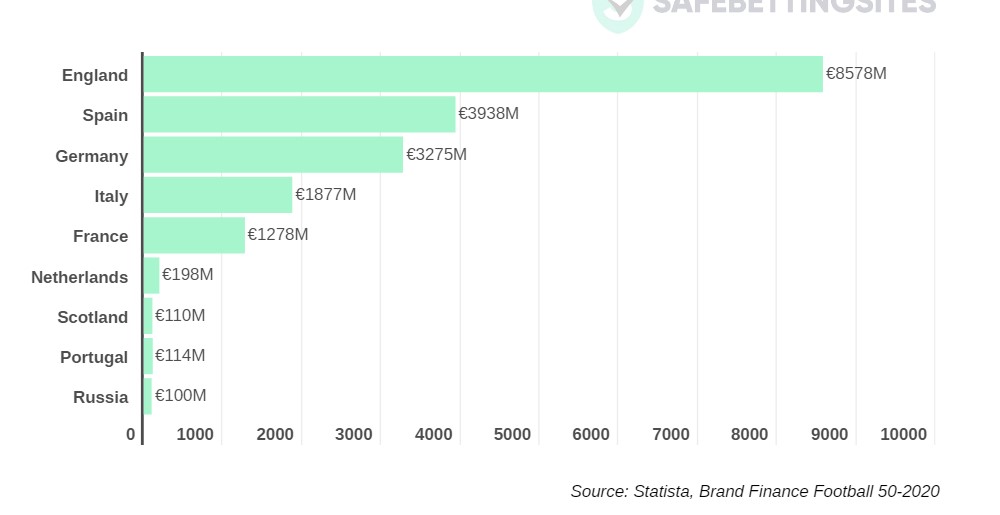 I ricavi dei cinque grandi campionati europei di calcio sono aumentati vertiginosamente negli ultimi vent'anni, raggiungendo i 17 miliardi di euro nella stagione 2018/2019. Ma occorre dire che c'è un netto divario tra la prima classificata e le altre, almeno fino allo scorso campionato (col COVID-19 potrebbero cambiare molte cose). la Premier League è infatti in cima alla lista delle competizioni calcistiche professionistiche in Europa, sia in termini di profitto che di valore del brand. Secondo i dati presentati da SafeBettingSites.com, la Premier League ha raggiunto 8,5 miliardi di euro di valore del marchio nel 2020, il 19% in più rispetto a La Liga e Bundesliga messe insieme.